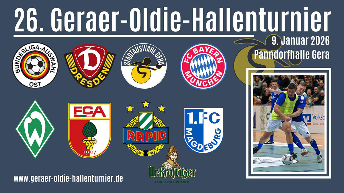 Etwas später als in den vergangenen Jahren freuen wir uns, Euch nun endlich die teilnehmenden Mannschaften zum 26. Geraer Oldieturnier, präsentiert von der Ur-Krostitzer Brauerei, vorstellen zu können. Dazu präsentieren wir zwei Highlights zum Turnier am 9. Januar 2026 in der Geraer Panndorfhalle.